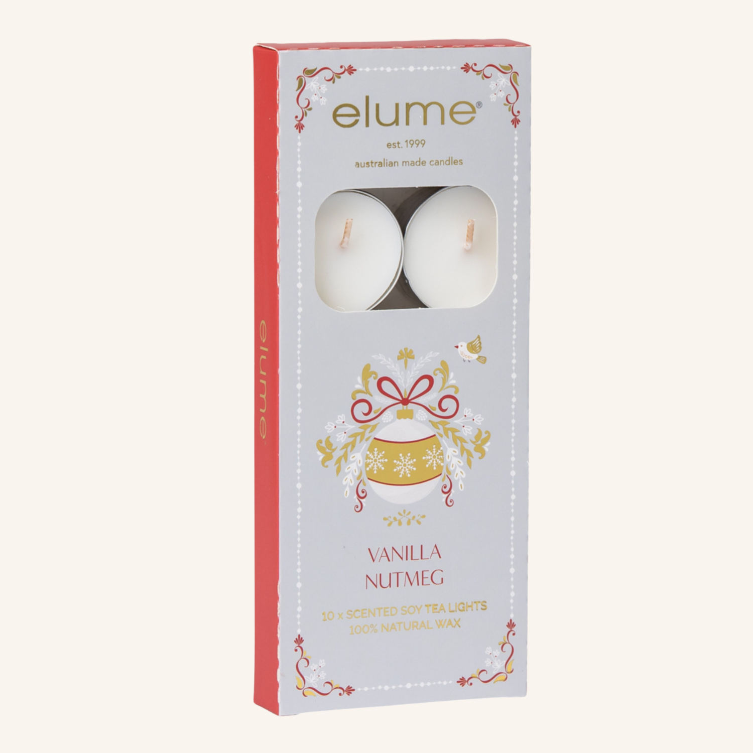 Elume's Christmas Vanilla Nutmeg Tealights are hard to resist! Made with 100% natural soy wax, premium quality fragrances and lead free cotton wicks to ensure the cleanest possible burn and exceptional scent distribution. Use in oil burners, tealight holders, cups or lantern to create a beautiful ambience. The gorgeous packaging with gold accents means they also make an ideal small gift.