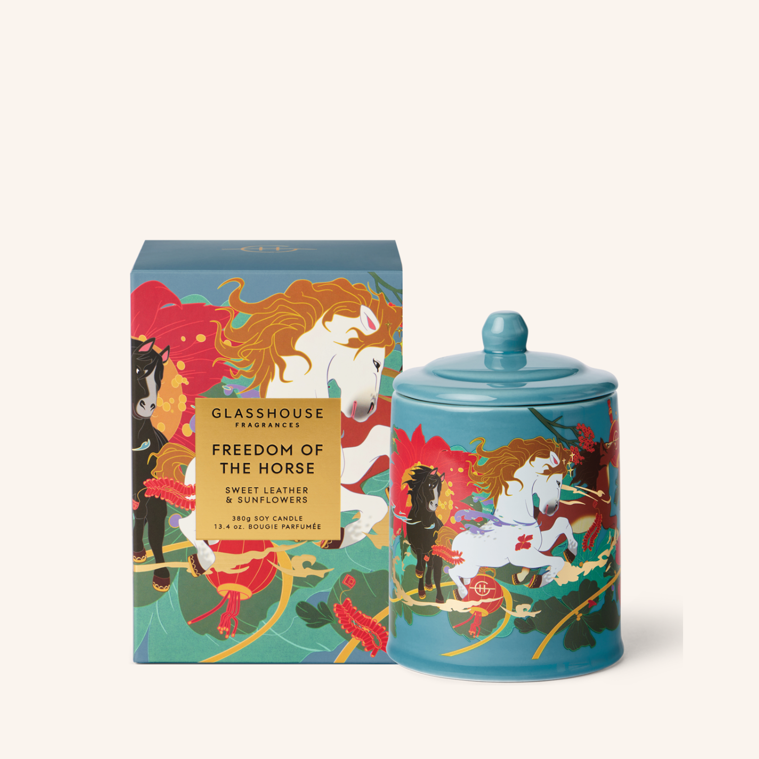 Celebrate the upcoming Year of the Horse with the Freedom of the Horse Sweet Leather & Sunflowers 380G Candle. It's time for the flaunting, adventurous lunar personality of those born under the Year of the Horse. Seductive and spicy, this fragrance is as free-spirited as a horse thundering at full gallop. Ginger brings lively passion to the mystical intensity of Sweet Leather and incense and the sparkle of Fruity Blooms.